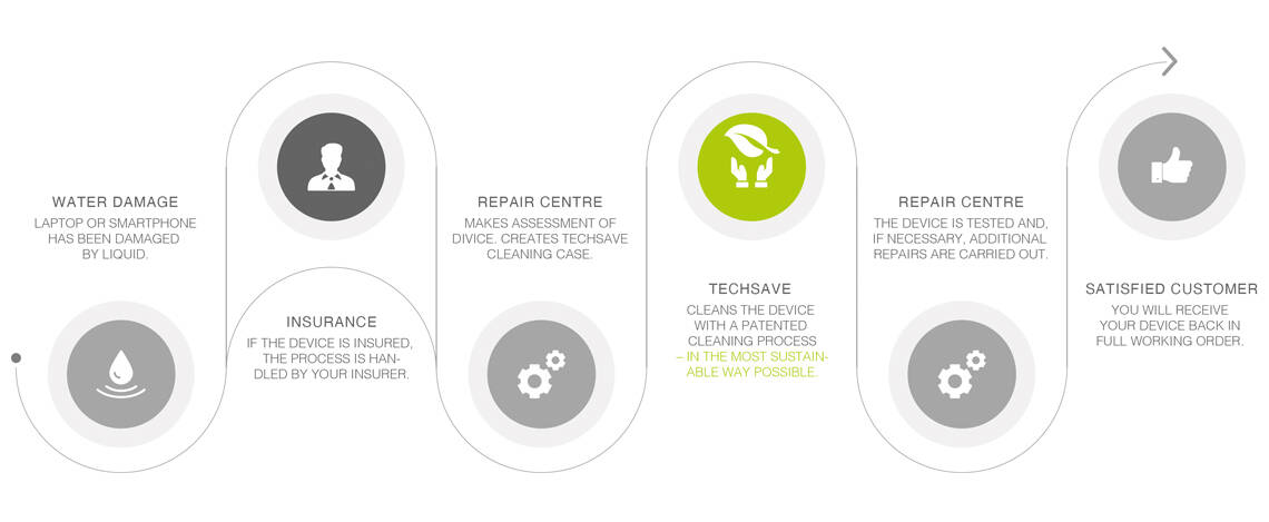 The faster you react after an incident, the more we can usually save. Thanks to its patented process, the Techsave machine can remove corrosion even from the smallest components, where manual cleaning of the device parts would never be possible. This distinguishes Techsave from other technologies that clean liquid-damaged devices.