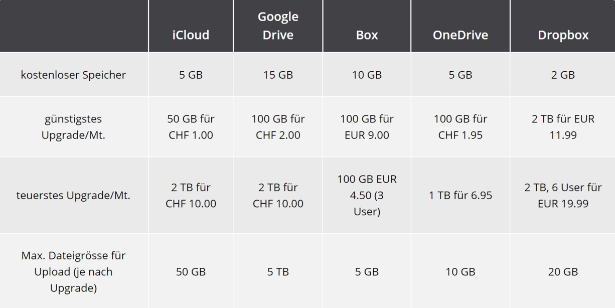 Mach dir in der folgenden Tabelle ein Bild im Vergleich verschiedener Cloud-Dienste. Die Angaben können von den Anbietern jederzeit geändert werden. Deshalb sind sie ohne Gewähr. Ausserdem gibt es Business-Abos, die meistens für mehrere Nutzer noch mehr Speicherkapazität bieten und entsprechend etwas teurer sind.