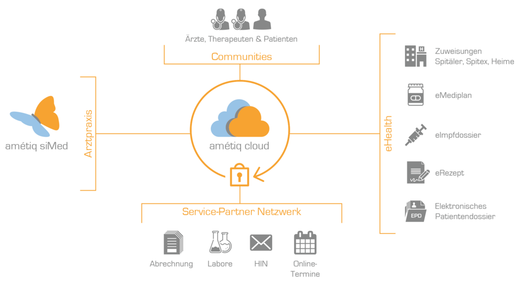 Die cloudbasierte Praxissoftware amétiq siMed vernetzt Praxen in der sicheren amétiq Private Cloud nahtlos mit vielen Partnern im medizinischen Ökosystem und macht sie eHealth-ready. amétiq siMed bietet niedergelassenen Ärzt:innen und Therapeut:innen die intuitive und moderne elektronische Krankengeschichte für alle Fachgebiete. Vollintegrierte Erweiterungen sorgen für durchgängige Praxisprozesse und die effiziente Administration – von der Terminierung bis zur Leistungsabrechnung.
