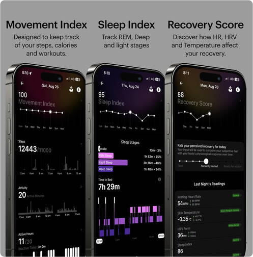 A comfortable and stylish smart ring that tracks your sleep, movement and recovery trends and encourages you to make healthier choices every day. Weighing just 2.4 grams, it's the lightest smart ring on the market. This sleek device combines minimalism with precise performance, allowing the user to effortlessly monitor sleep, exercise, heart rate, heart rate variability and skin temperature.